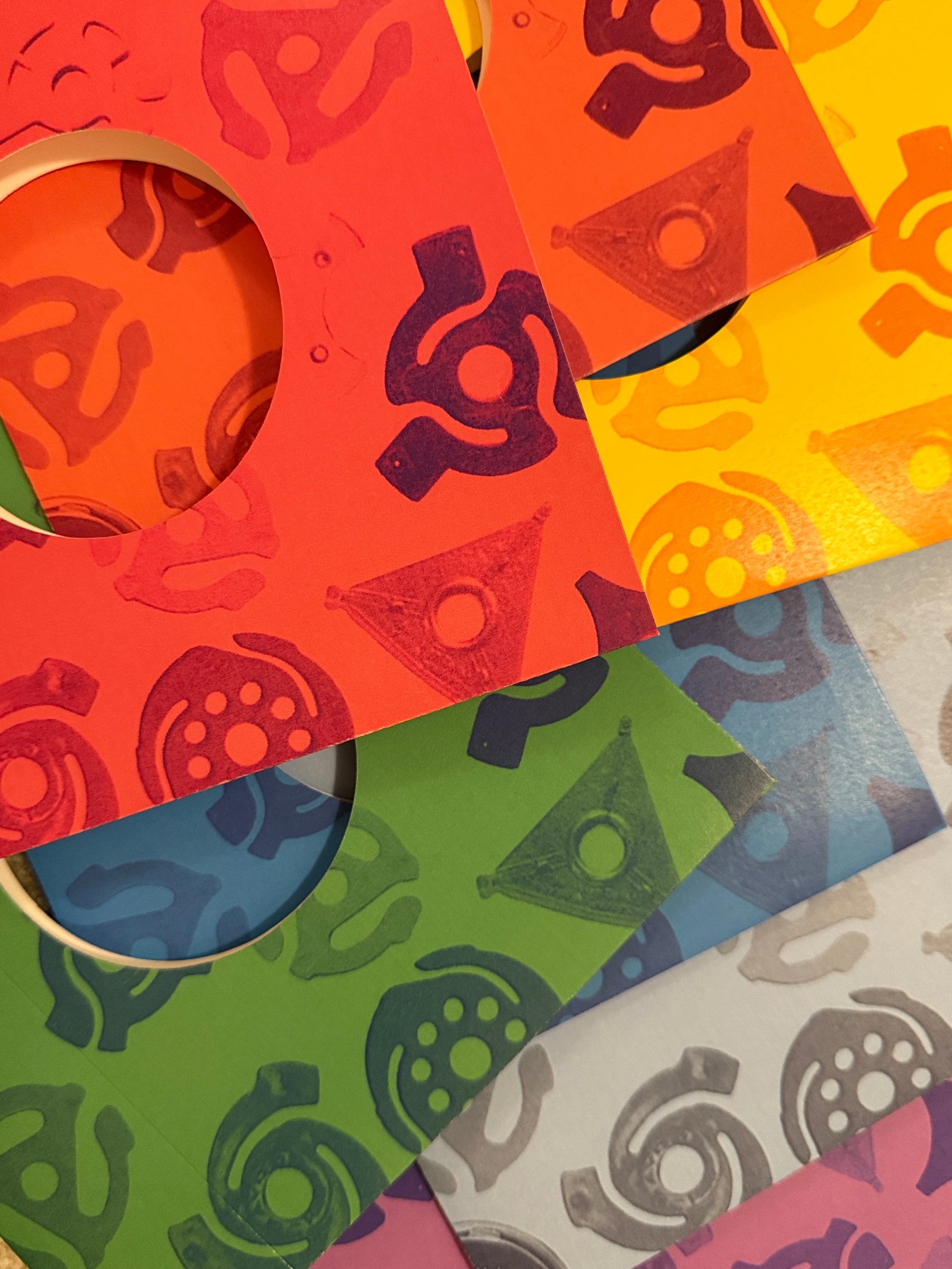 This run celebrates the iconic 45 adapter, printed in a full range of vibrant hues. Every sleeve is slightly unique, thanks to the hands-on process and variable ink patterns—collectible, functional, and just the right amount of flashy.
