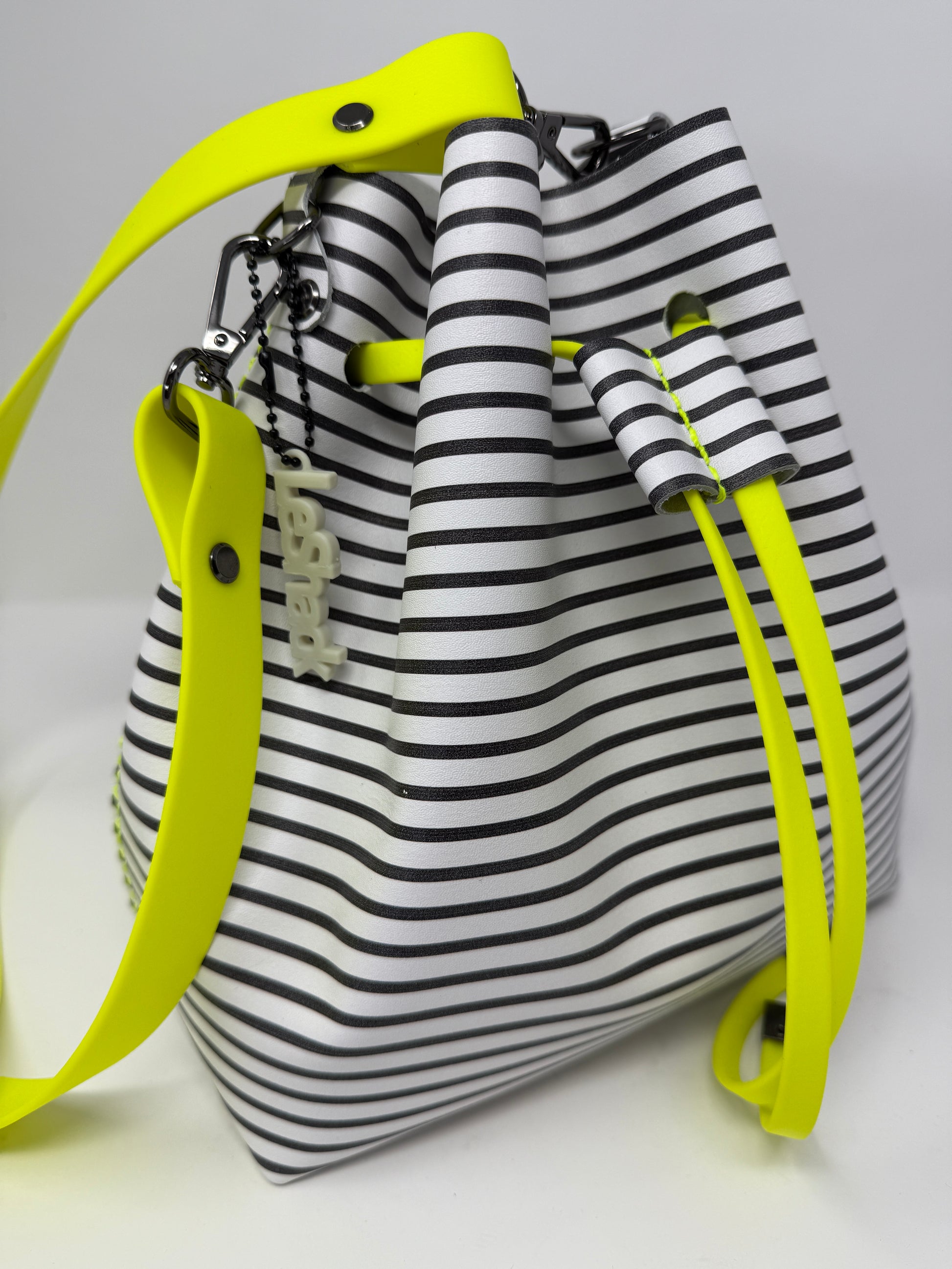 This one is made with black and white striped leather with neon yellow stitching and a neon yellow Biothane drawstring and shoulder strap with heavyweight black hardware. It also has our “find yer keys” strap, a leather care kit, and a dust bag to store your bag in so it stays protected when not in use.