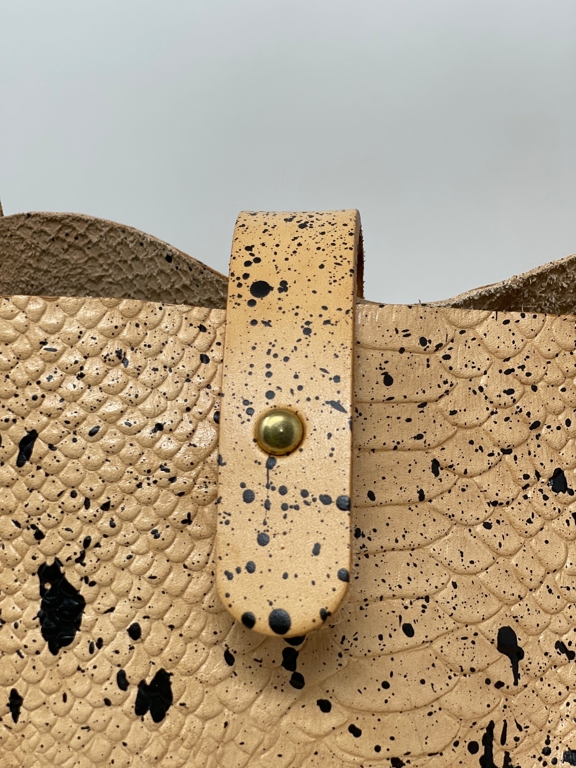 Black Splatter Veg Tan Leather Open Top Crossbody Tote