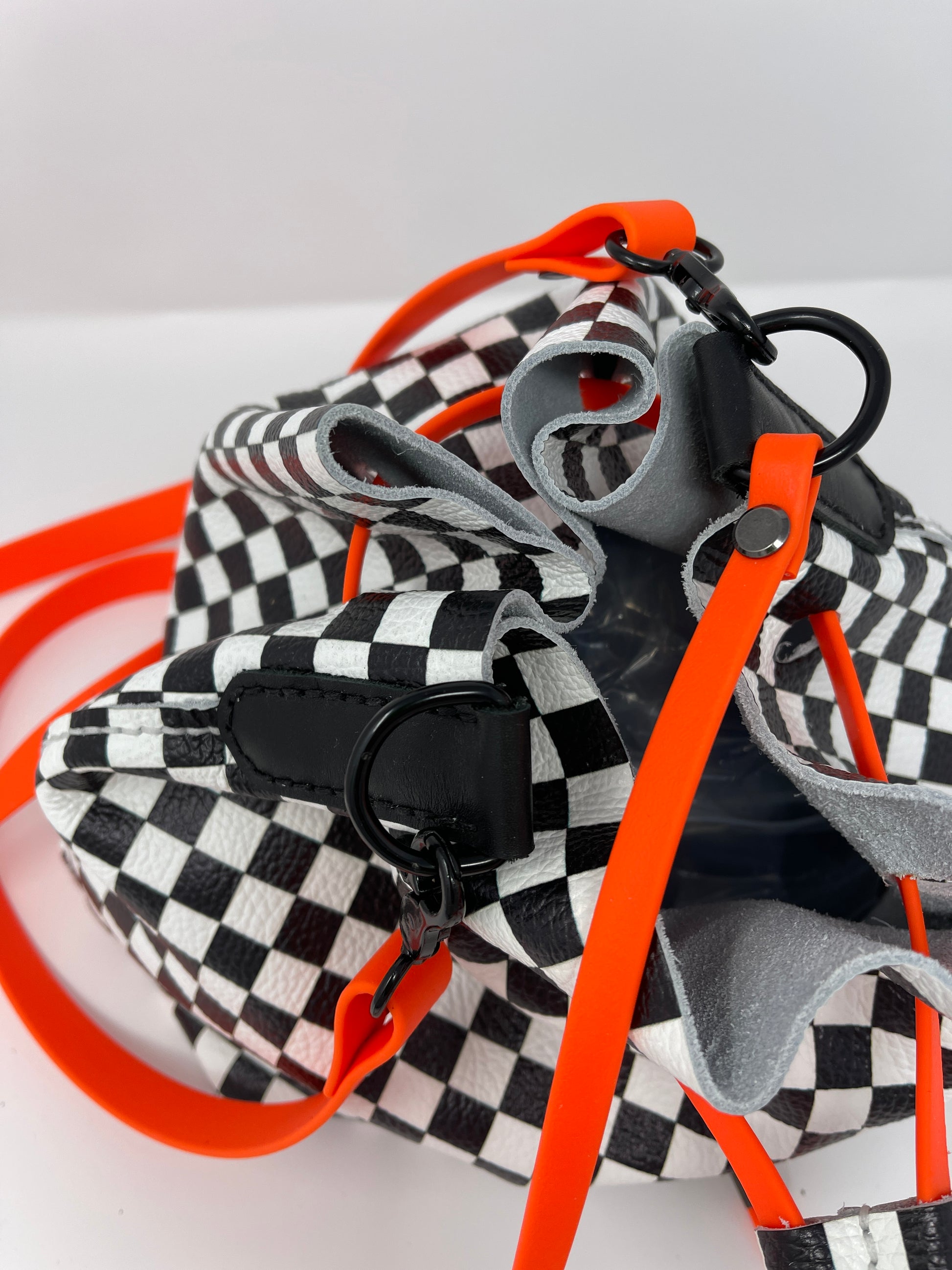 Checkerboard Leather and Neon Orange Drawstring Crossbody Bucket Bag