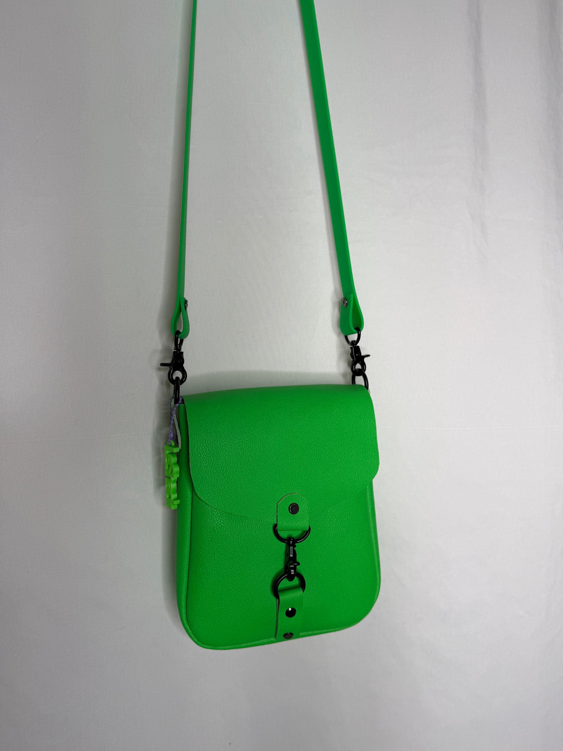 This is a one-of-a-kind handmade, very limited edition bag as we only were able to get a small amount of this super neon green leather. It's a great size, fits just enough for when you don't want to carry a giant bag. High quality stainless hardware and super neon green Biothane crossbody strap. Additional neon straps available, just ask us!