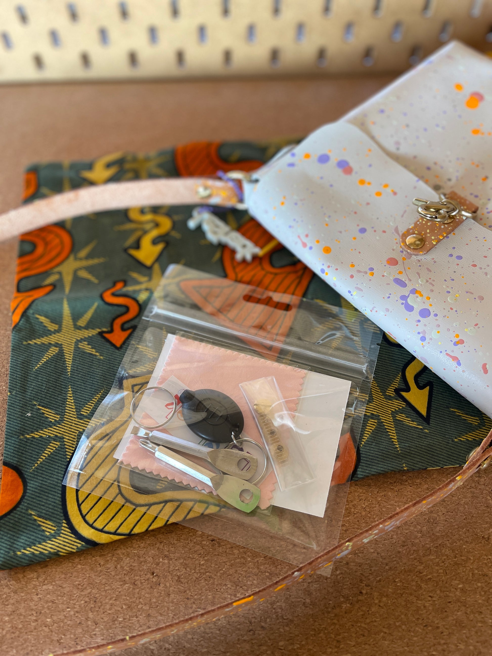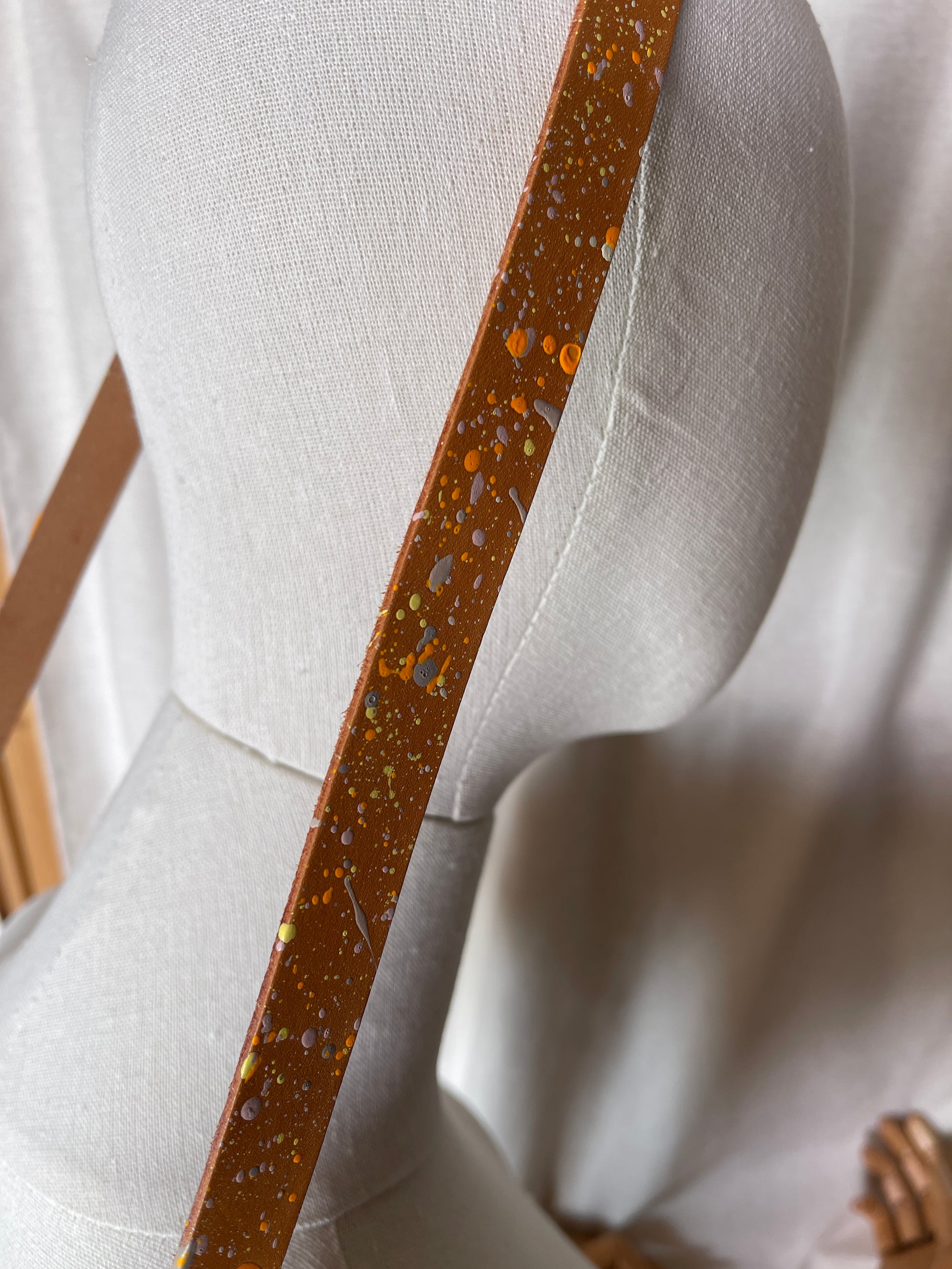 One-of-a-kind, hand painted 4 oz beige leather in a smallish squareish shoulder bag style with a matching hand painted natural veg tan strap in a fixed length. Hand sewn with visible neon orange thread. High quality solid brass hardware. Minimal finishing. Comes with our cotton dustbag to protect while not in use, and our bag care kit, which includes basic care instructions, extra hardware and polishing cloth, and a mini screwdriver set.